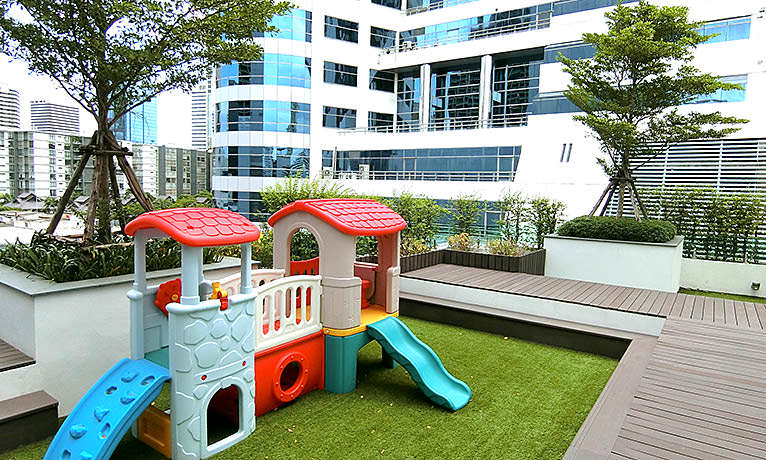 The rooftop area is well-equipped with a swimming pool, fitness gym, dry and steam sauna, outdoor and indoor children’s play areas, and a golf practice range.