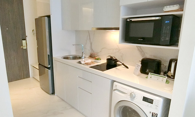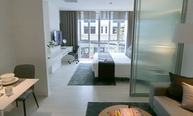 As a hotel-style serviced apartment, all rooms feature high-end, clean, and stylish interiors with a white color theme.